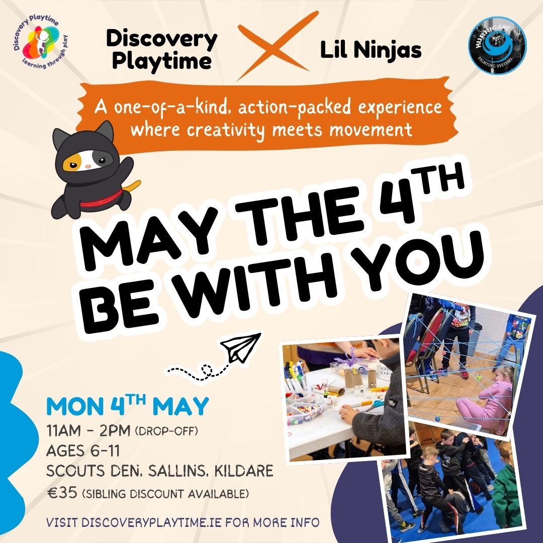 Our FREE Family Play Day at Sallins Scouts Den runs from 2 to 3pm and 3:30 to 4:30pm and gives families a real experience of how Discovery Playtime supports confidence, creativity and emotional development through structured play.